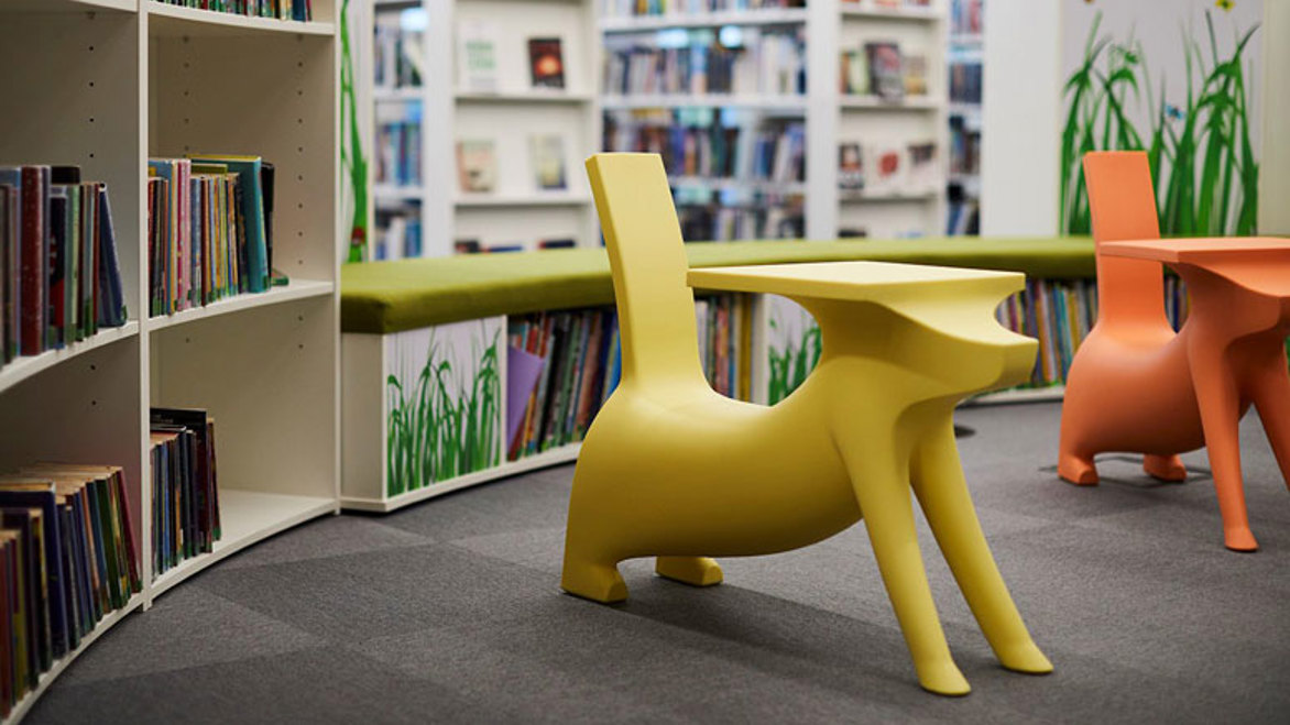 The Children’s Library is bursting with colour and has many items of interactive furniture for little ones to climb, hide and perch to read their favourite books.