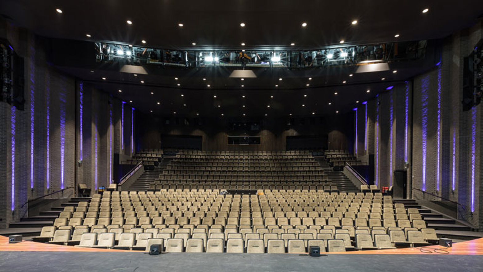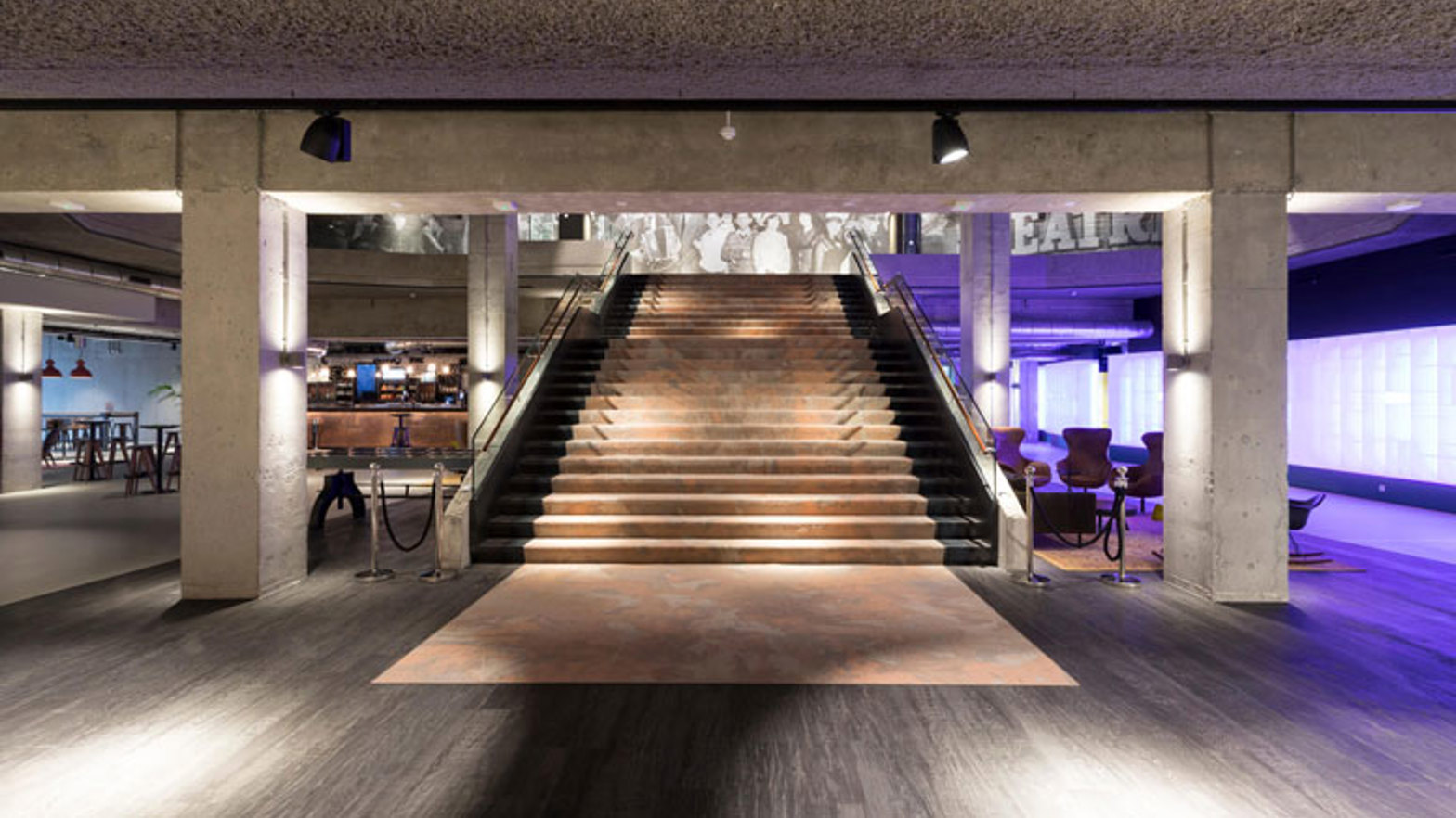 In the original design, the library took up half of the building’s space and was separated from the theatre by a wall. By taking down the barriers, more space, light and a new idea for the foyer were created. This room metamorphosed from a virtually always-empty space into a shared multi-functional living space where you can work, study or meet up. The eye-catcher of this space is found in the foyer: the theatre staircase is equipped with a beautiful handrail and a reddish-pink carpet that is finished on both sides with blue steel. The bar in the foyer was fashioned from copper and is now propped against a rough brick backdrop coupled with an LED screen and light box. The ‘break drinks cabinet’ absolutely steals the show, both thanks to its size and the changing coloured lighting.