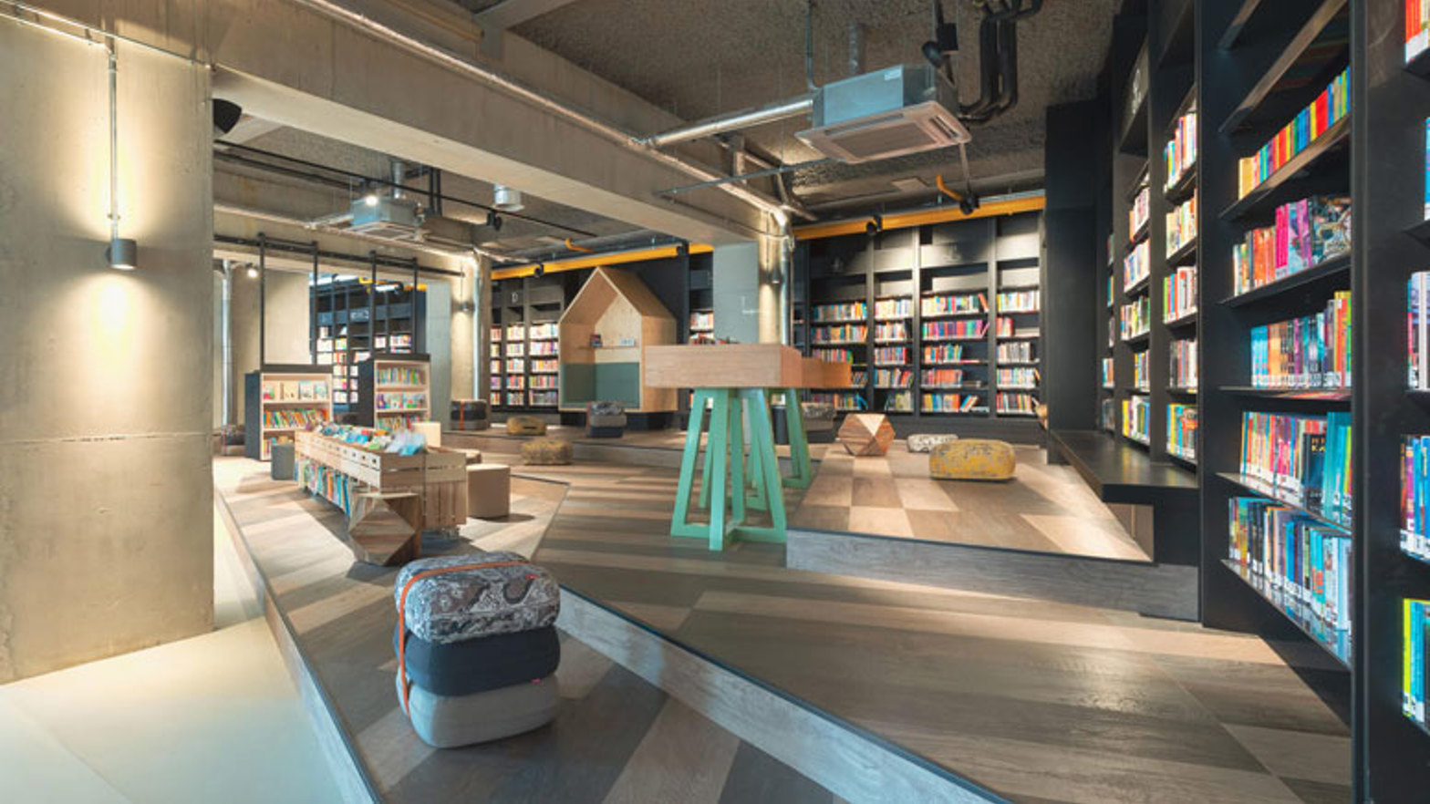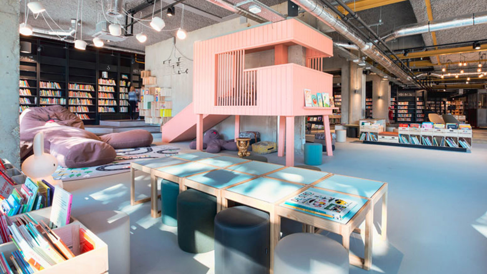 The children’s corner in the building has a distinctive character thanks to its bright colours and striking specials. On a large round carpet with a comfortable couch and seats you will find the so-called ‘Book starter Corner’ for the little ones. Other eye-catchers in the children’s corner are the large stage featuring a ramp, floors with a wooden look, boxes full of picture books and of course the pink climbing castle. The enormous stuffed animal of no less than 6.5 meters is a climbing rabbit that makes this corner the place to be for the youngest target group of HUB.