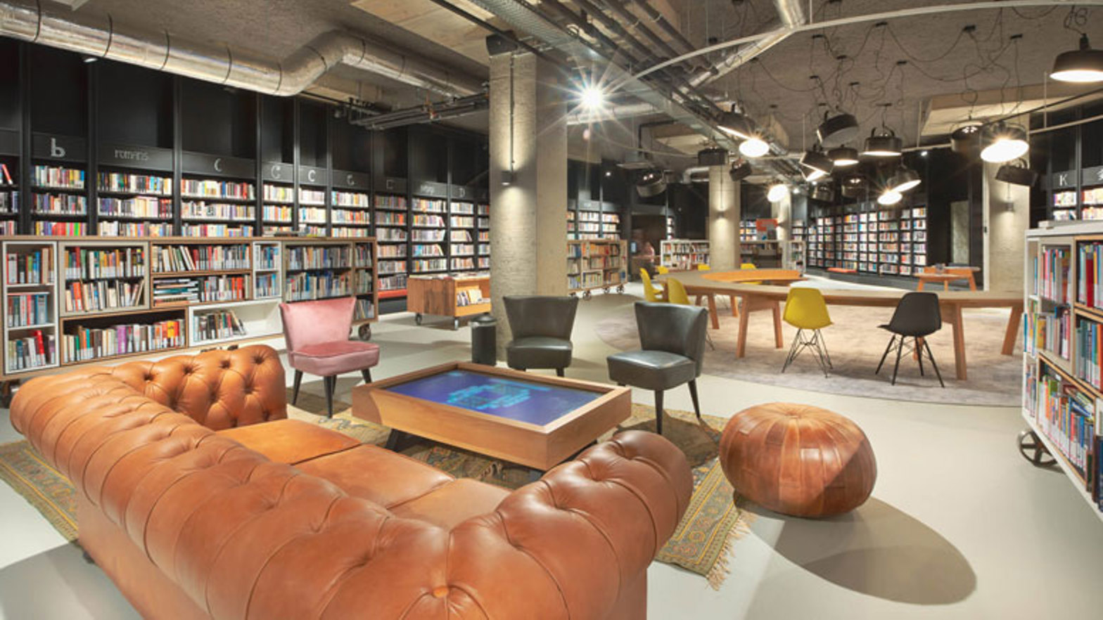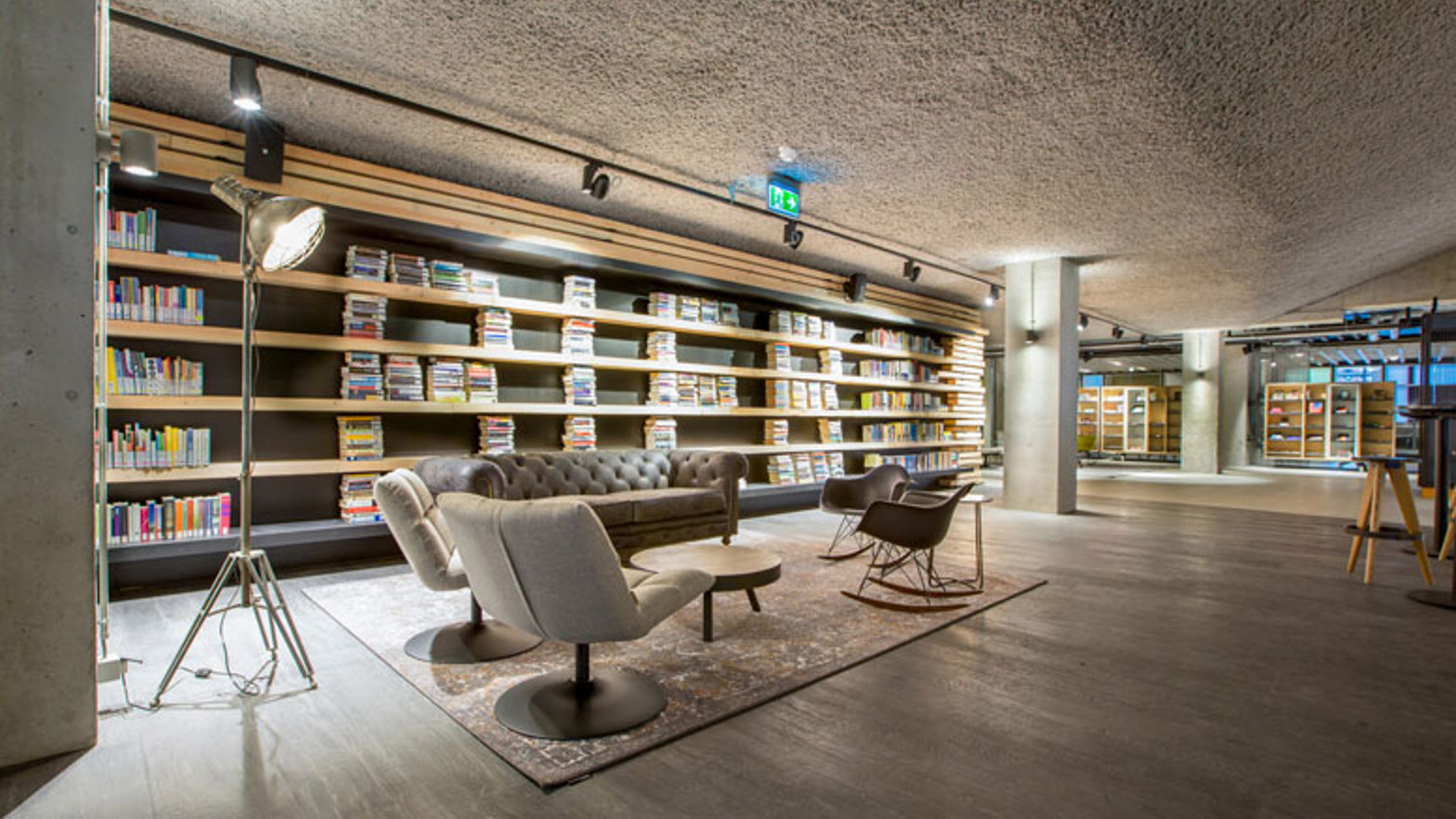 Books, niches, nooks and the furniture provide scale and intimacy in the large building’s robust concrete casing. The library is literally and figuratively woven through the building. From the entrance to the children’s corner, the different spaces are continuously connected by one long bookcase. Various functions such as sitting and reading areas, computer facilities, information points, digital screens and play facilities for children have been incorporated in this winding bookcase wall. The bookcase varies in depth, creating interesting sightlines that give the building a special perspective. Reading corners and fabric-covered niches act as cosy retreat opportunities, further shaping the intimacy of the building. There are also fine meeting places for smaller groups such as the Course Island in the side wing of the building; the island is equipped with modern presentation facilities and can be closed off entirely by a curtain.