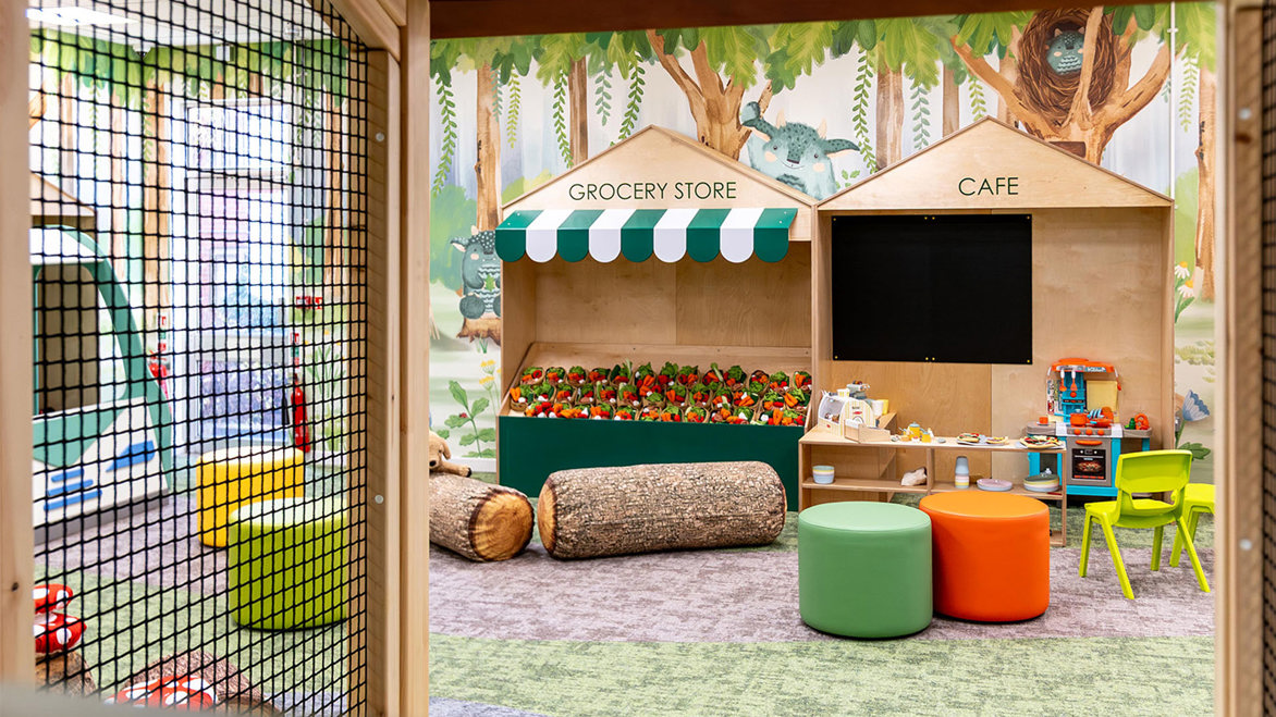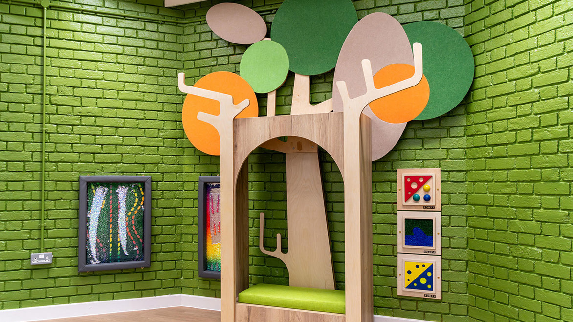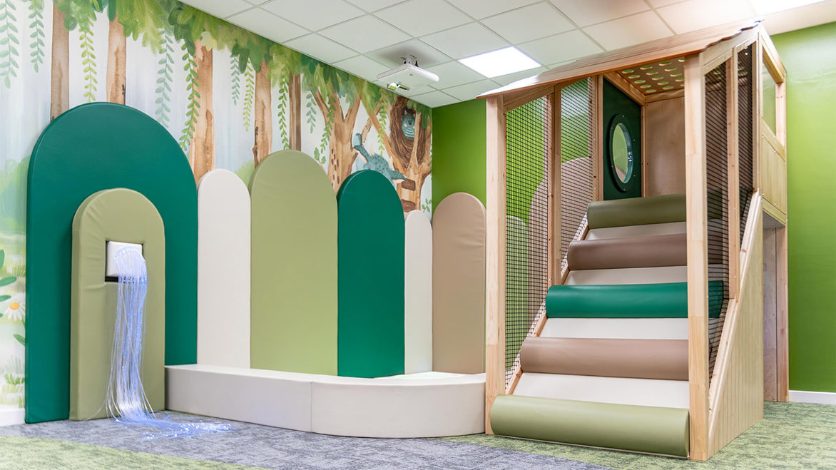 This engaging environment features a range of interactive elements designed to stimulate curiosity and learning, including fibre optic strands for tactile interaction and projected games for visual engagement. A playful shopfront encourages children of all ages to develop early mathematical and communication skills through imaginative play. From climbing through the treehouse and peering through its windows, to boarding the bespoke animal rescue bus or building in the repair shop, the forest-themed setting offers something for everyone.
