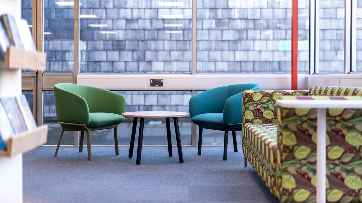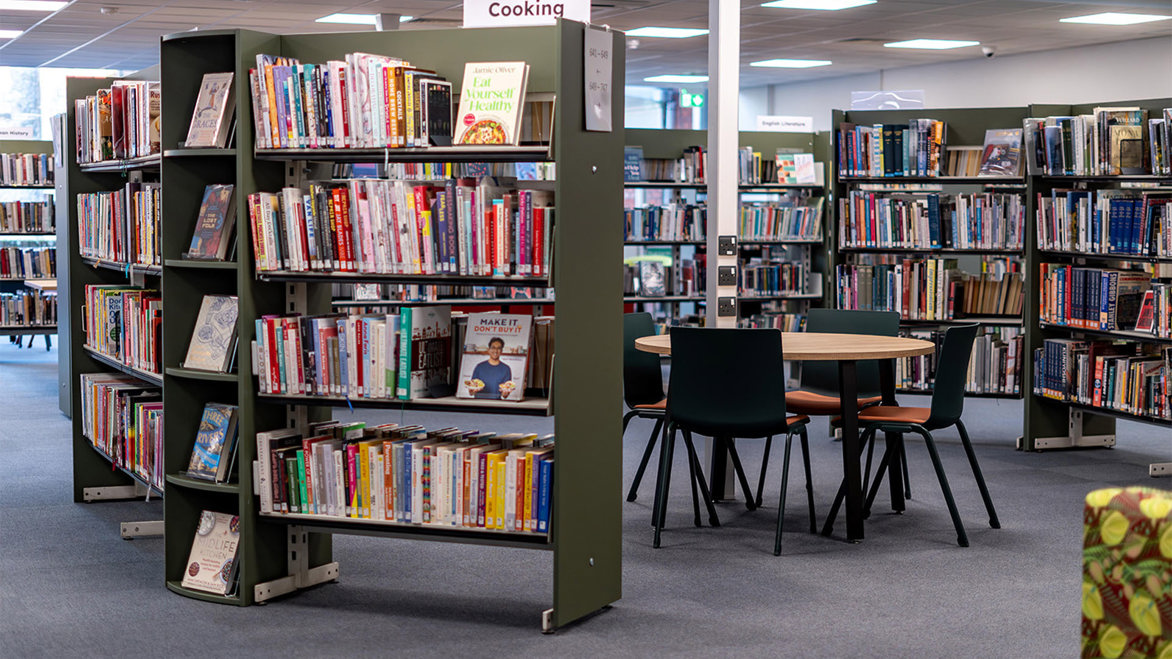 Repurposing furniture, such as some of the existing shelving at Colchester, has become a forward-thinking and sustainable design choice best for modernised yet socially friendly local libraries. The aim here was to reduce waste and lower renovation costs while preserving materials that still ultimately have functional shelf-life.