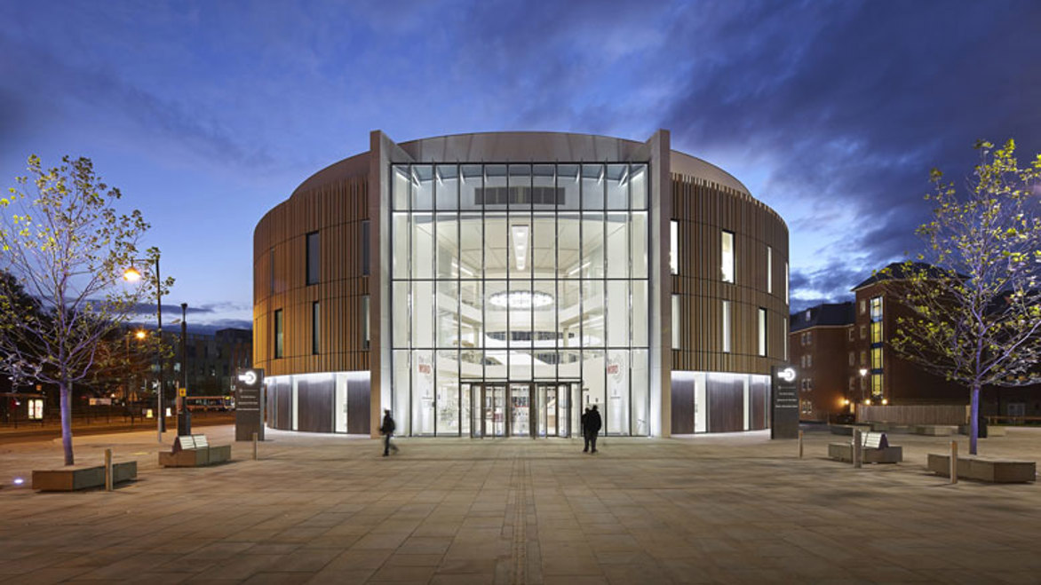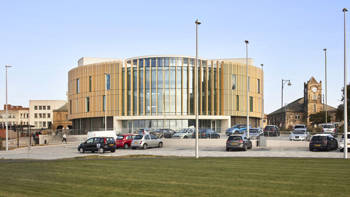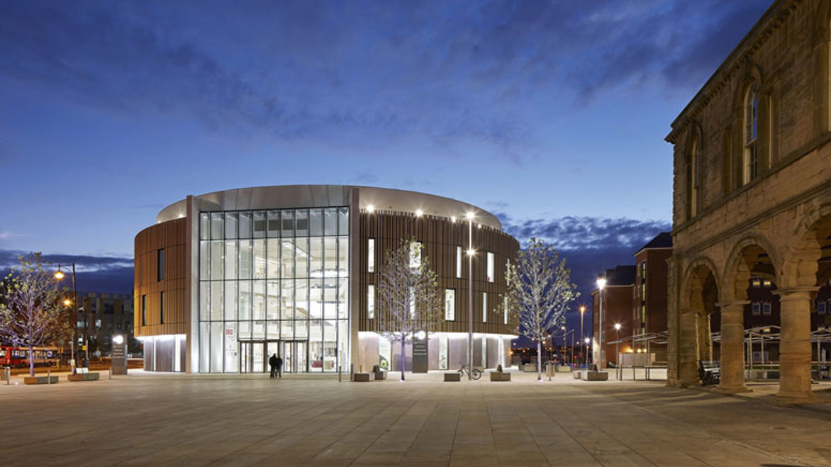 The building concept adopts a simple circular form to reinforce the pedestrian link and views between the Riverside Park and Market Square. The buildingâs appearance is inspired by the fanning out of the pages of a book, with the introduction of two large glass walls providing superb views of the River Tyne and creating a natural place for the buildingâs entrance.